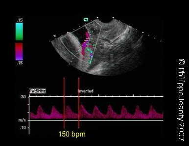 Vasa Praevia confirmed by Colour Doppler ultrasound (note the fetal pulse at 150bpm)